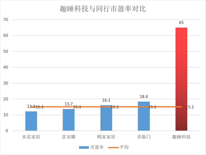 目前趣睡科技市盈率(TTM)高达 65 倍,而主要竞争对手 —— 喜临门(603008.SH)、顾家家居(603816.SH)、水星家纺(603365.SH)、富安娜(002327.SZ)的市盈率分别为 18.4 倍、16.1 倍、12.2 倍和 13.7 倍,行业平均市盈率为15.1倍,趣睡科技估值是行业均值的 3 倍以上。