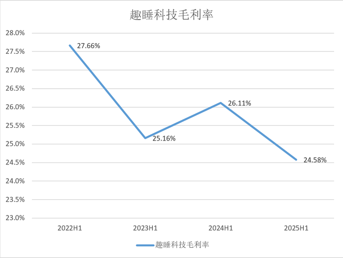 2022年上半年至2025年上半年,趣睡科技销售毛利率分别为27.66%25.16%26.11%24.58%,整体呈下降趋势,2025年上半年毛利率较2022年上半年下降3.08个百分点。