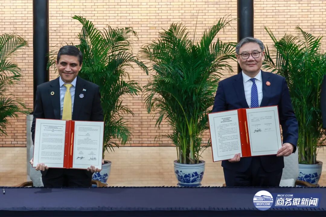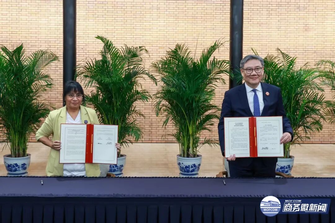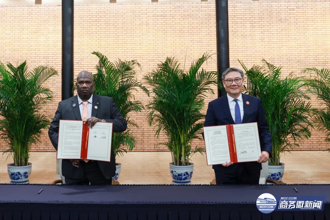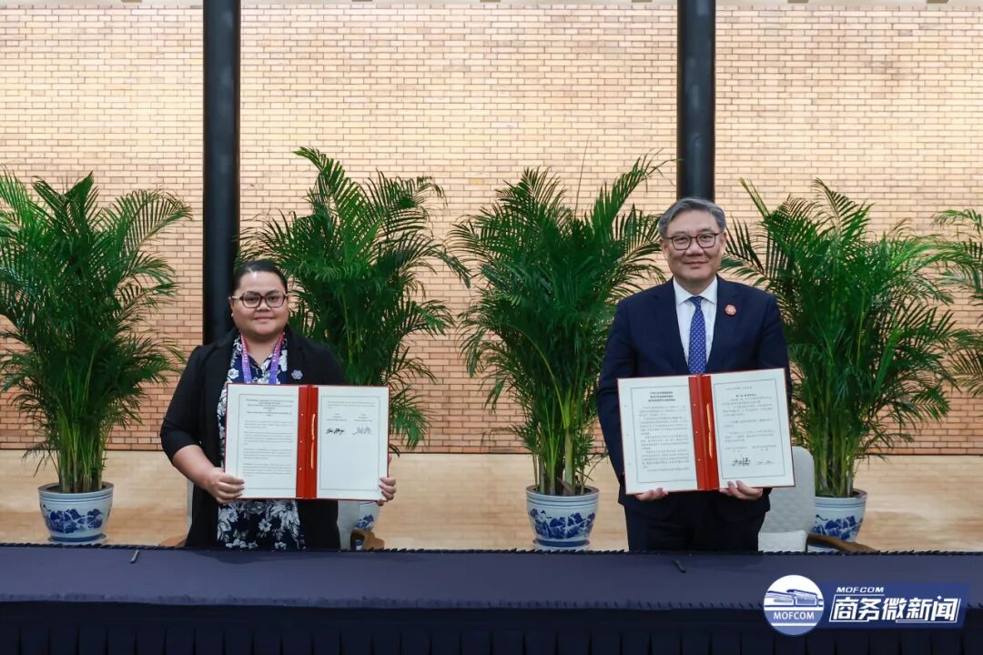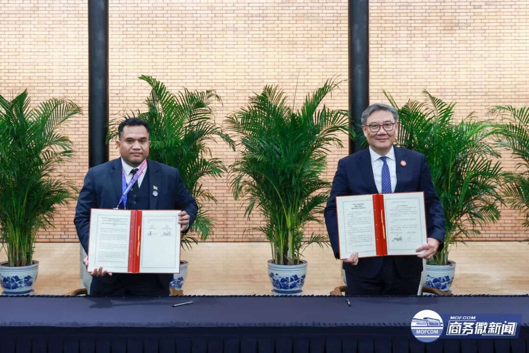 11月4日,商务部部长王文涛与密克罗尼西亚联邦资源和发展部部长秋永,基里巴斯旅游、商务、工业和合作部部长里特,瑙鲁磷酸盐矿部部长托马,瓦努阿图外交、国际合作与对外贸易部部长阿蒂,斐济贸易、合作社、中小微企业和通信部常秘阿里举行集体会见。会见后,王文涛部长与五国代表分别签署《提升经济伙伴关系框架协定》(简称《框架协定》)。