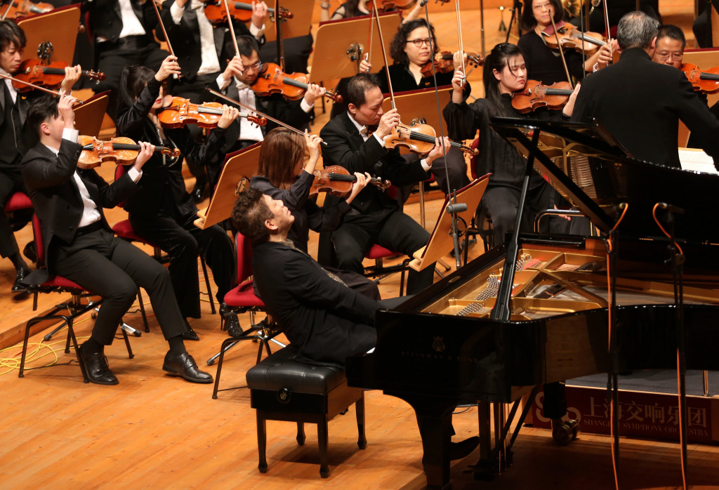 至第二乐章,刘孟捷的音色兼蓄柔情如水和坚如磐石,浣洗出伤逝婉转的悲歌,坚毅又抒情。而乐队哀愁婉转的弦乐如天鹅绒般顺滑,美不胜收。第三乐章钢琴几度以极快的切分节奏奋力推进时,刘孟捷可谓是投入了最强力,纵情于与乐队的交织,情绪饱满高亢,如凤凰涅槃的宏大气势令人深受触动。返场加演的拉赫玛尼诺夫《e 小调音乐瞬间》和格林费尔德《维也纳之夜》(改编自小约翰•施特劳斯 《蝙蝠》),则更多展现出刘孟捷在技巧和音色上的“珠峰之旅”。