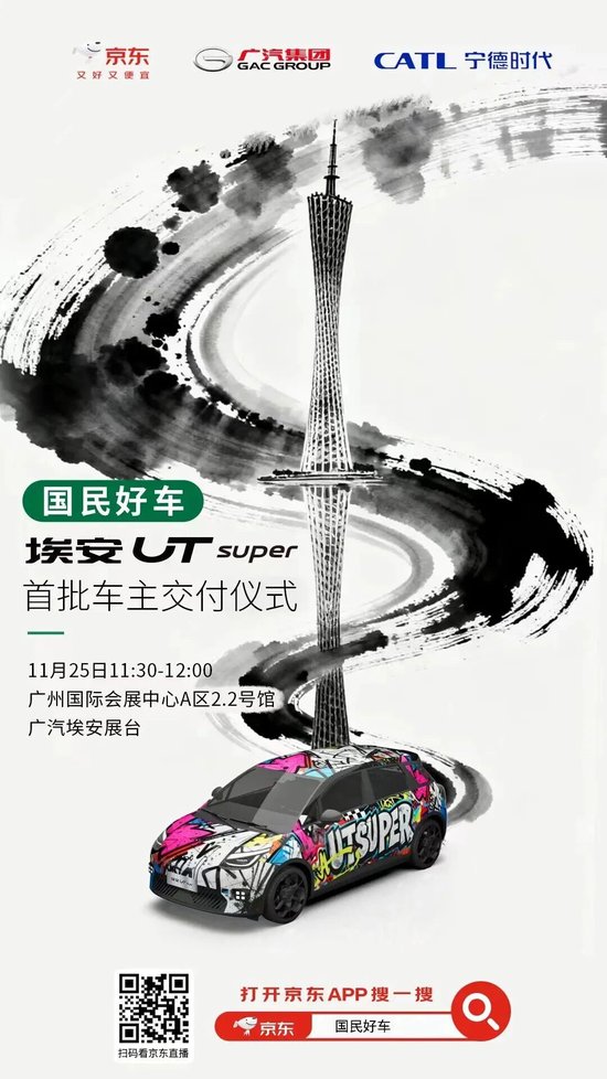 11月25日,京东、联合推出的“国民好车”——埃安UT super首批车主交付仪式在广州车展上举行。