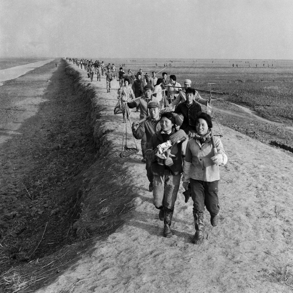 《围垦大军》。施湾地处东海和长江口,长年累月的涨潮退潮,把冲积的淤泥逐渐成为海滩,而且一直在向外延伸。为了使海滩变良田,人们总在几年后,在滩涂上筑坝围田,增加耕地面积。图为围垦大军完成了一天的任务收工回家。 1974年摄于施湾。