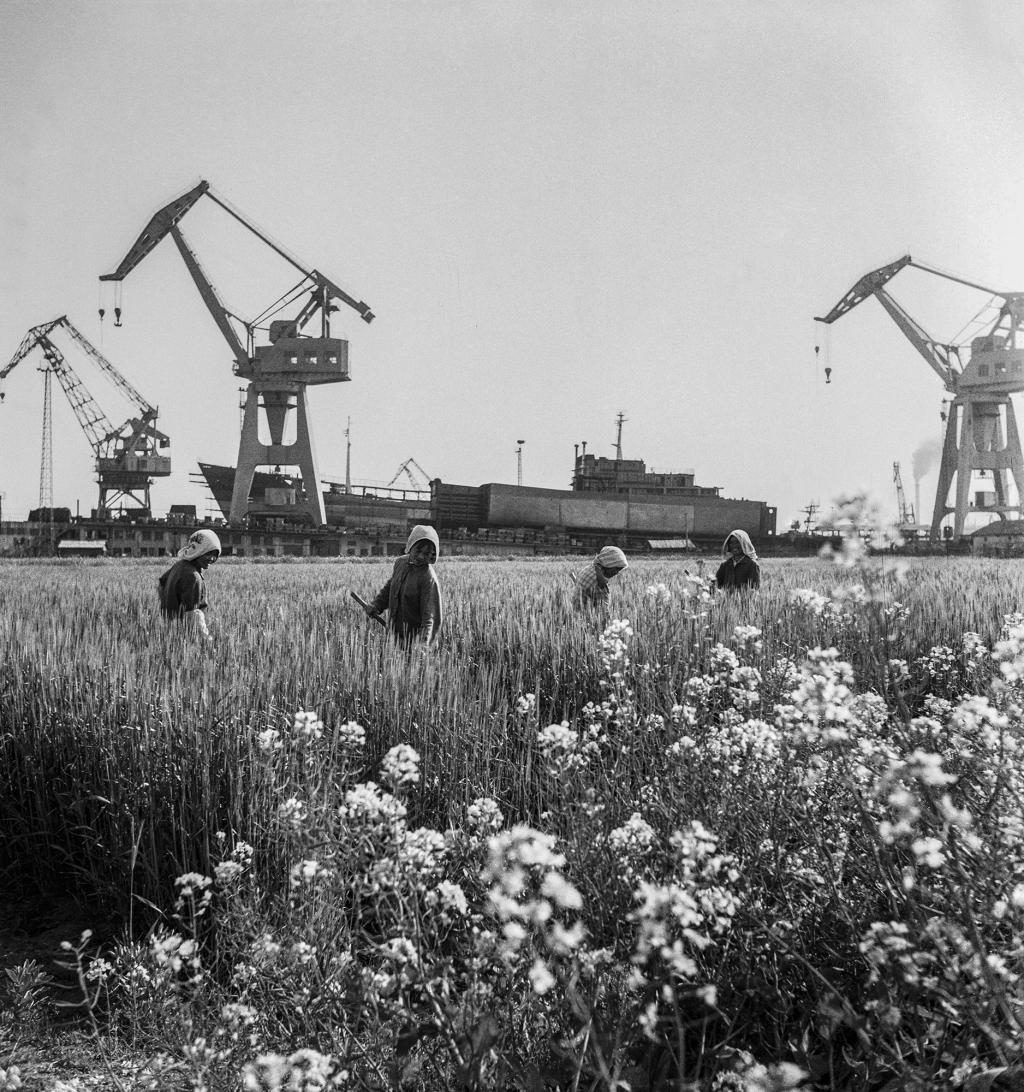 《农田与船厂》。东沟朱家浜地处东沟造船厂外围。这边麦儿青青菜花黄,那边塔吊林立造船忙,好一派工农相融的新气象。 1978年摄于东沟。