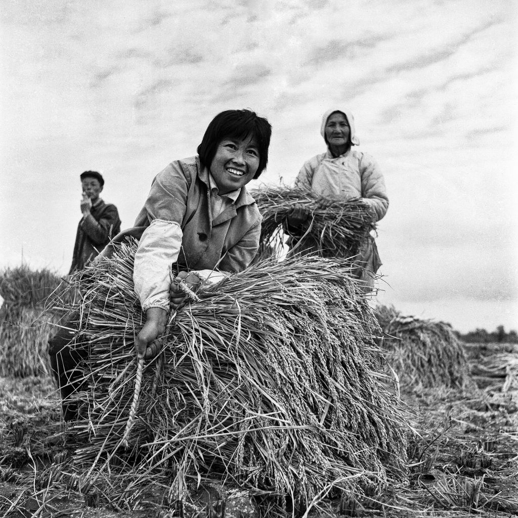 《喜收稻谷》稻谷的收割堆束也是农民们的基本技术。割稻要交叉稻把,便于快干;束捆稻把要方整站立,便于挑担运输。 1973年摄于孙桥。
