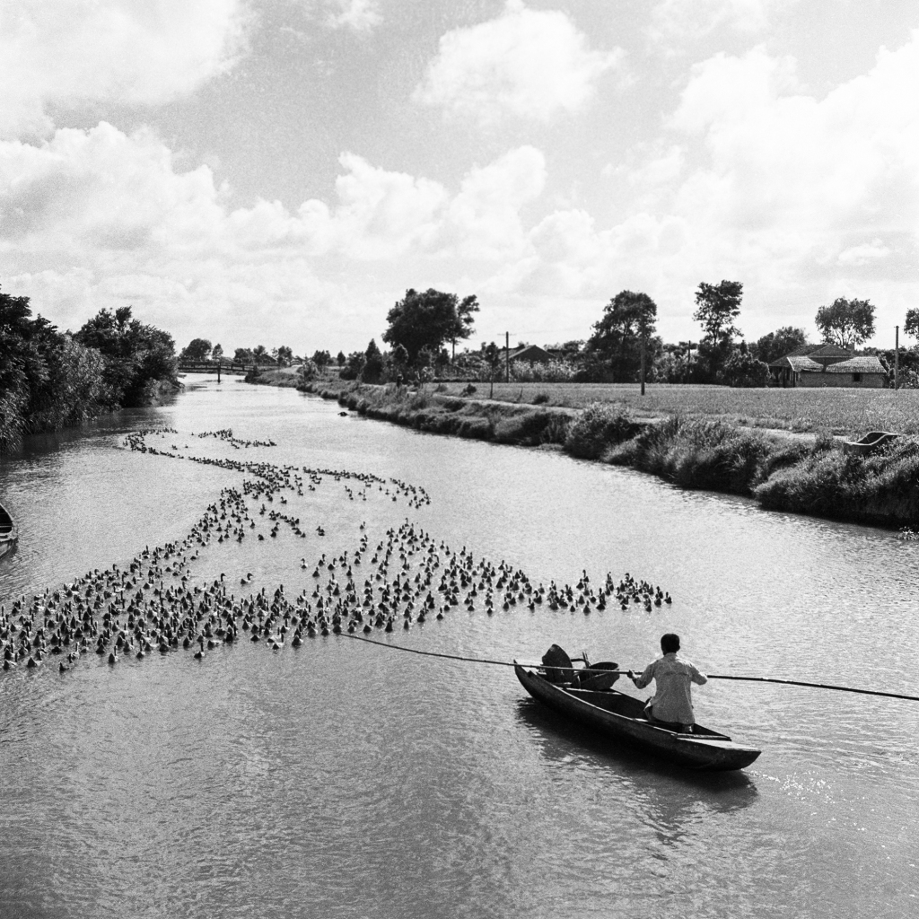 《群鸭散养》。植物野生环保,畜禽散养鲜美。川沙原本除了田野就是河流。广大养鸭户就利用天然的河流散养鸭子。1979年摄于孙桥。
