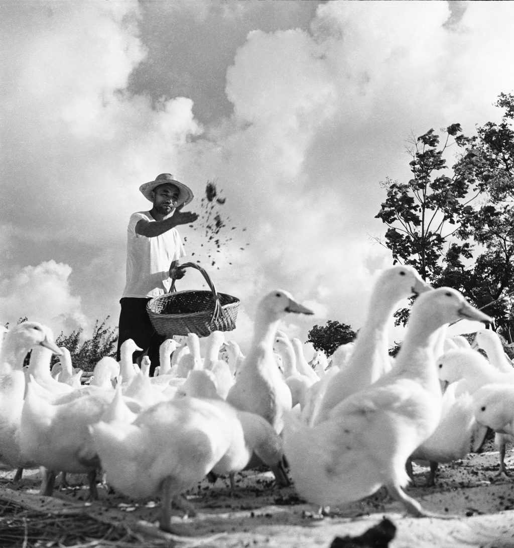 《人勤鸭肥》。麻鸭是蛋鸭,白鸭是肉鸭,不同的鸭子有不同的饲养方法。这是饲养员在抛撒精饲料,使鸭子只只有肥有大。1981年摄于孙桥。