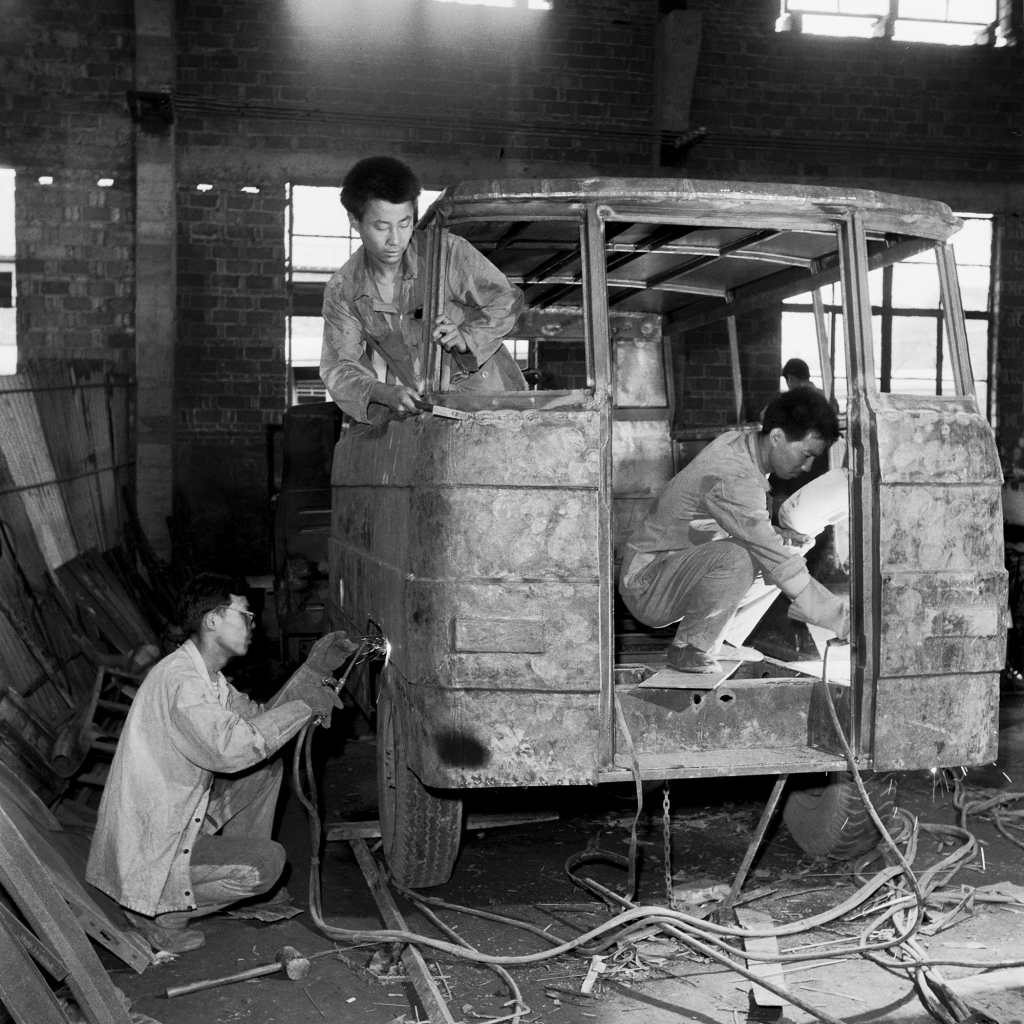 《汽车修配》。为发展集体经济,张桥乡依靠群众的智慧,办起了汽车修配厂,为农用汽车进行装潢和修配。1988年摄于张桥。