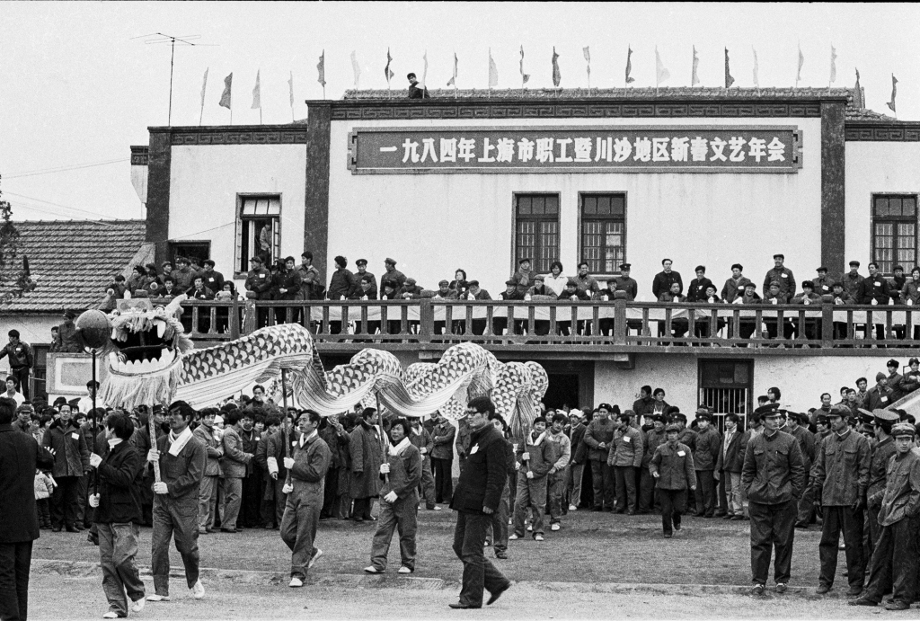 新春期间,川沙地区各企业单位在川沙体育场联合举办大型迎春文艺活动。1984年摄于川沙体育场。
