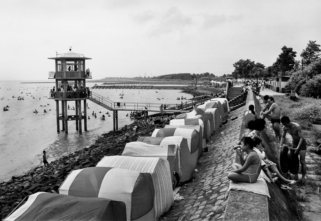 《高东海滨浴场》高东海滨浴场曾做过测绘涨落潮水哨所,后却成了广大游客游泳嬉水、观光度假的好地方。1989年摄于高东海滨浴场。