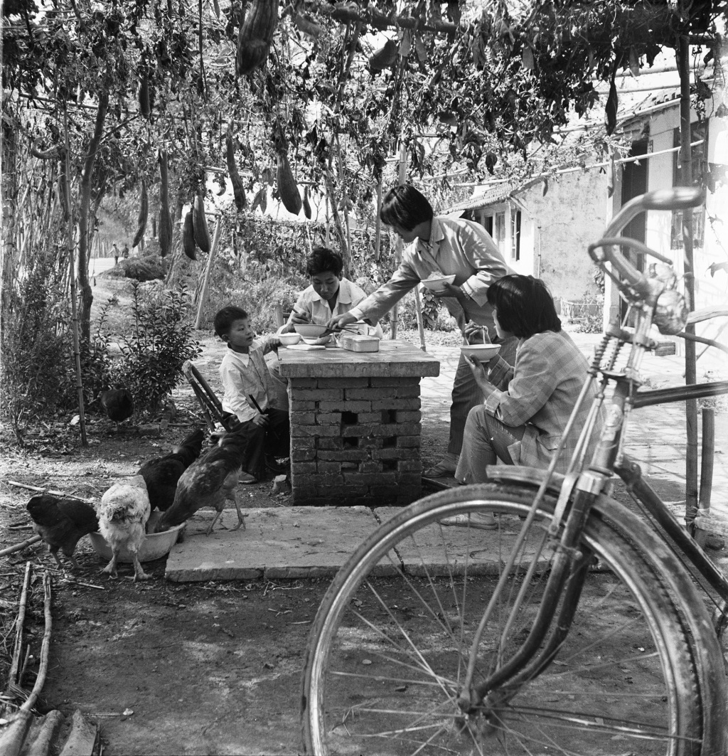 《乘凉午餐》。上世纪七十年代的农家,基本多为单层平房。门前的小场地可搭丝瓜棚乘凉,洗衣台可当桌子吃饭打牌等。1976年摄于黄楼。