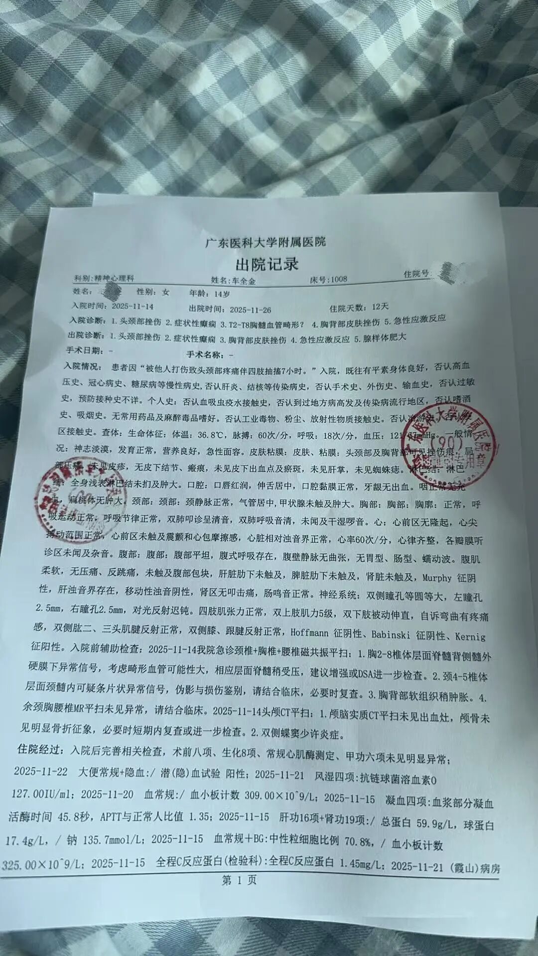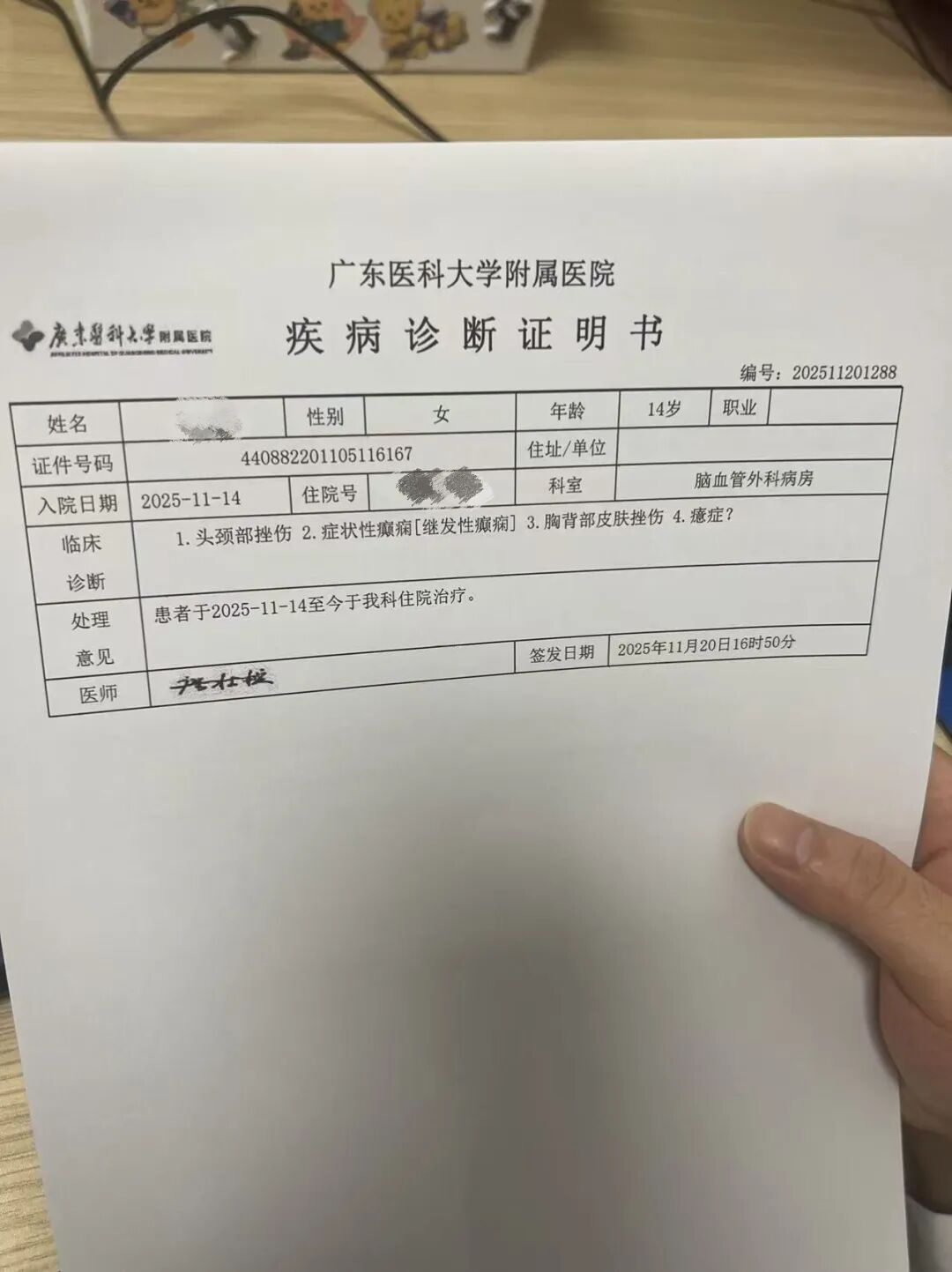 朽女士称,送医途中,车某先后被英利中心卫生院、雷州市仁康医院拒收,最终被广东医科大学附属医院接受治疗,截至11月25日已住院14天。医院出具的疾病诊断证明书显示,车某确诊为头颈部挫伤、症状性癫痫(继发性癫痫)、胸背部皮肤挫伤,同时标注癔症待查。朽女士表示,事发前孩子极少生病,如今癫痫发作毫无规律,病情始终未见好转,家人十分担忧。
