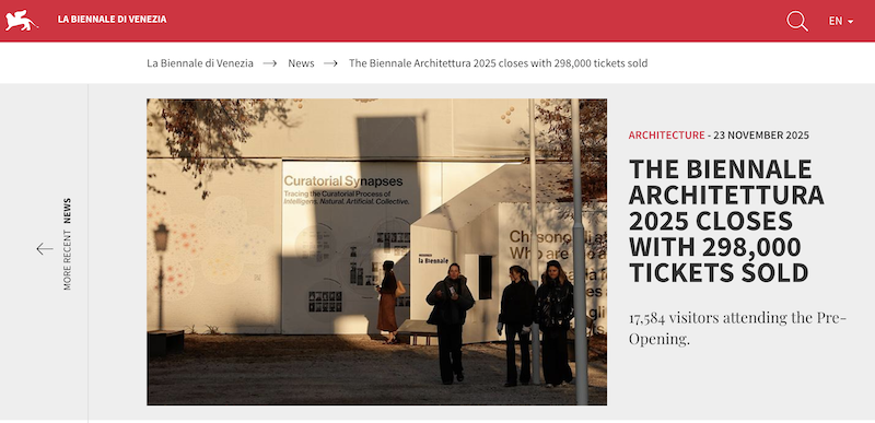 澎湃新闻了解到,2025年,由卡洛拉蒂策展的第19届威尼斯国际建筑双年展于11月23日闭幕。据数据统计,该展览共售出29.8万张门票,较2023年的第18届建筑双年展增长5%,并有17,584名观众参加了预展,成为威尼斯双年展有史以来参观人数最多的一届。