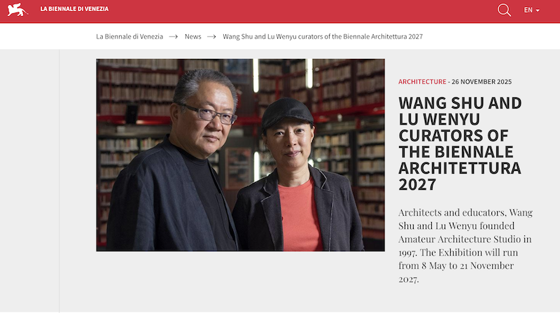 澎湃新闻获悉,威尼斯双年展官网11月26日宣布,经威尼斯双年展董事会主席皮特朗格洛布塔福科(Pietrangelo Buttafuoco)推荐,中国建筑师王澍、陆文宇将出任2027年第20届威尼斯双年展总策展人,这是该展览举办以来,首次由中国建筑师担任总策展人。