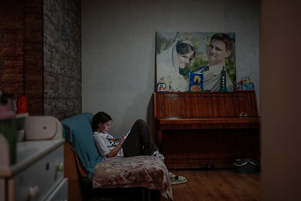 当地时间2025年10月24日,乌克兰基辅州,DTEK维修技师奥列克桑德亚当丘克的女儿坐在家中的沙发上。视觉中国 图