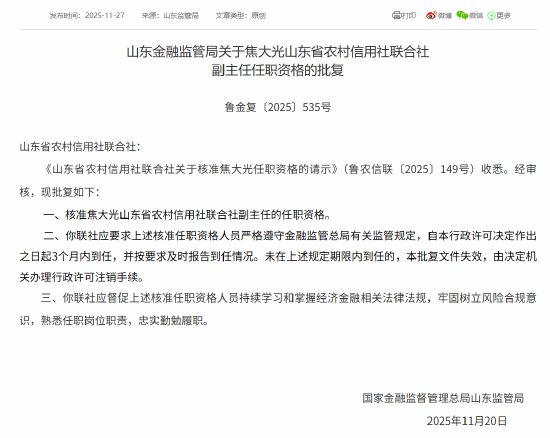 11月27日金融一线消息,山东金融监管局发布批复,核准傅宝汉山东省农村信用社联合社副主任的任职资格和焦大光山东省农村信用社联合社副主任的任职资格。