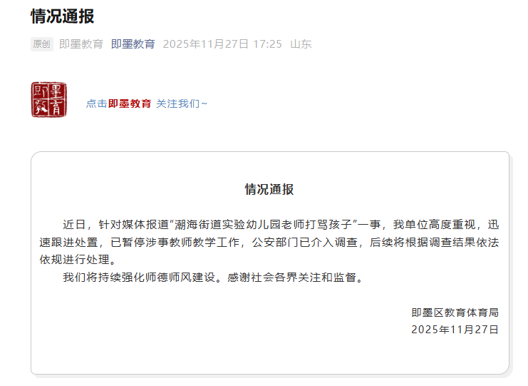 针对媒体报道“潮海街道实验幼儿园老师打骂孩子”一事,11月27日,青岛市即墨区教育体育局发布情况通报称,警方已介入调查。