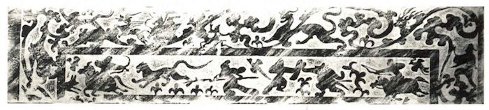 相关图像如四川乐山九峰乡出土一具石棺上,侧面刻辎车和神兽图像。车由一匹翼马所拉动,翼马优游举蹄徐徐而行,羽翼展开,尾巴扬起又垂下;辎车后方游动着一条青龙与一尾鱼,青龙头带角,瞠目,开口吐舌,曲颈,张牙舞爪,龙身修长而蜿蜒;远方还有一座带斗拱的殿堂(图16)。在这块画像石上,天马与青龙相组合在一起,乃天马以“龙为友”的形象展示,显示出浪漫的神话色彩;它们的线条曼妙而流畅,显示出高超的艺术审美力与造型能力。