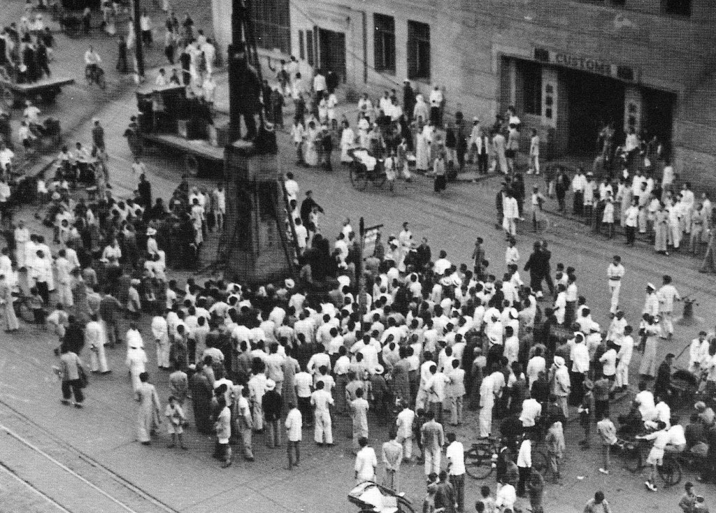 1941年,日军占领上海后,拆除海关大门前赫德铜像的情形